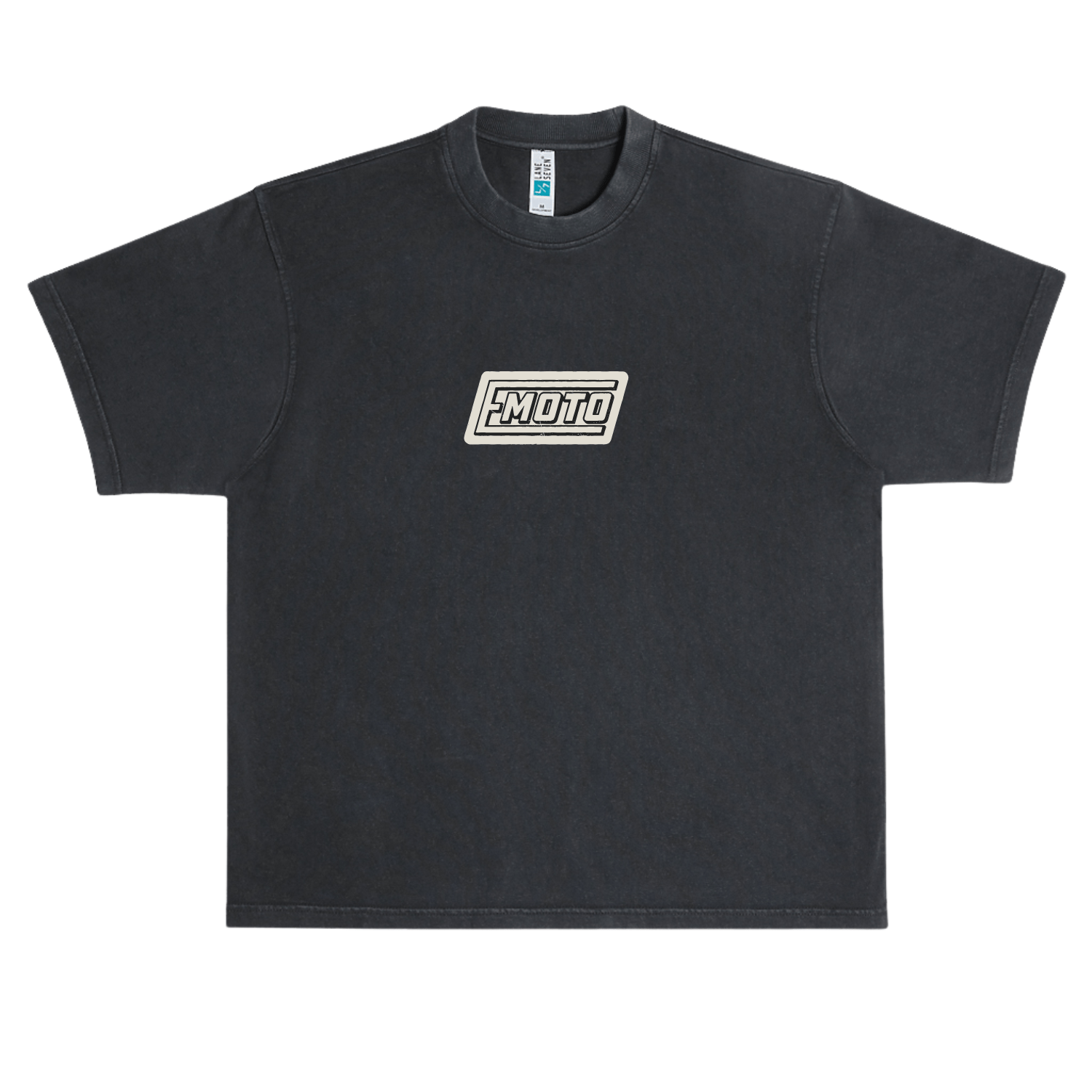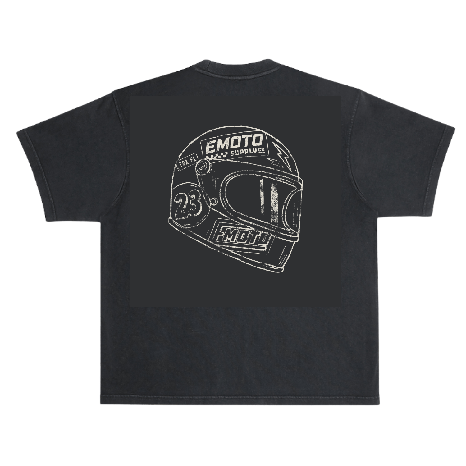 The pigment-black wash gives this tee a rich, deep tone and subtle vintage character, while crisp EMOTO branding and helmet graphic pop against the dark backdrop — clean, confident, and built to ride.