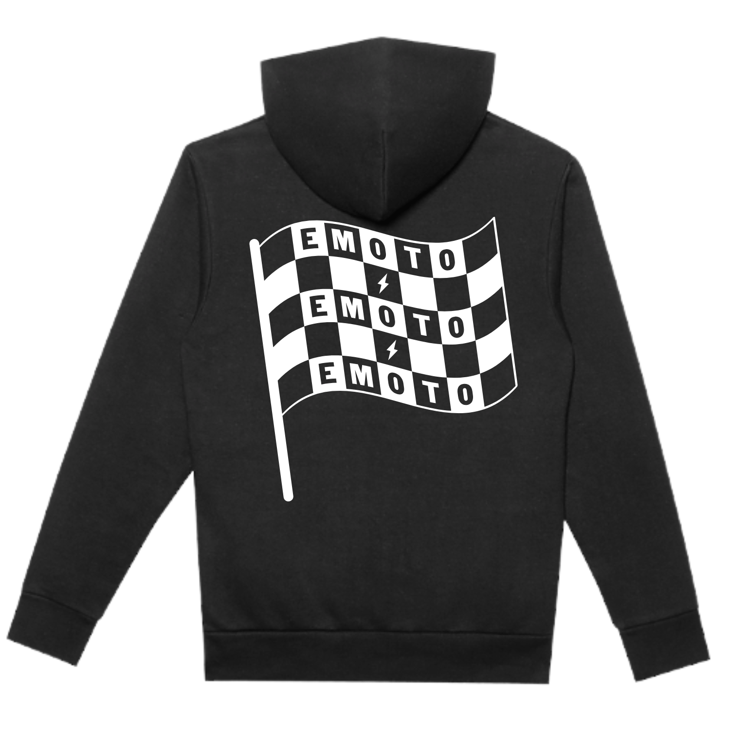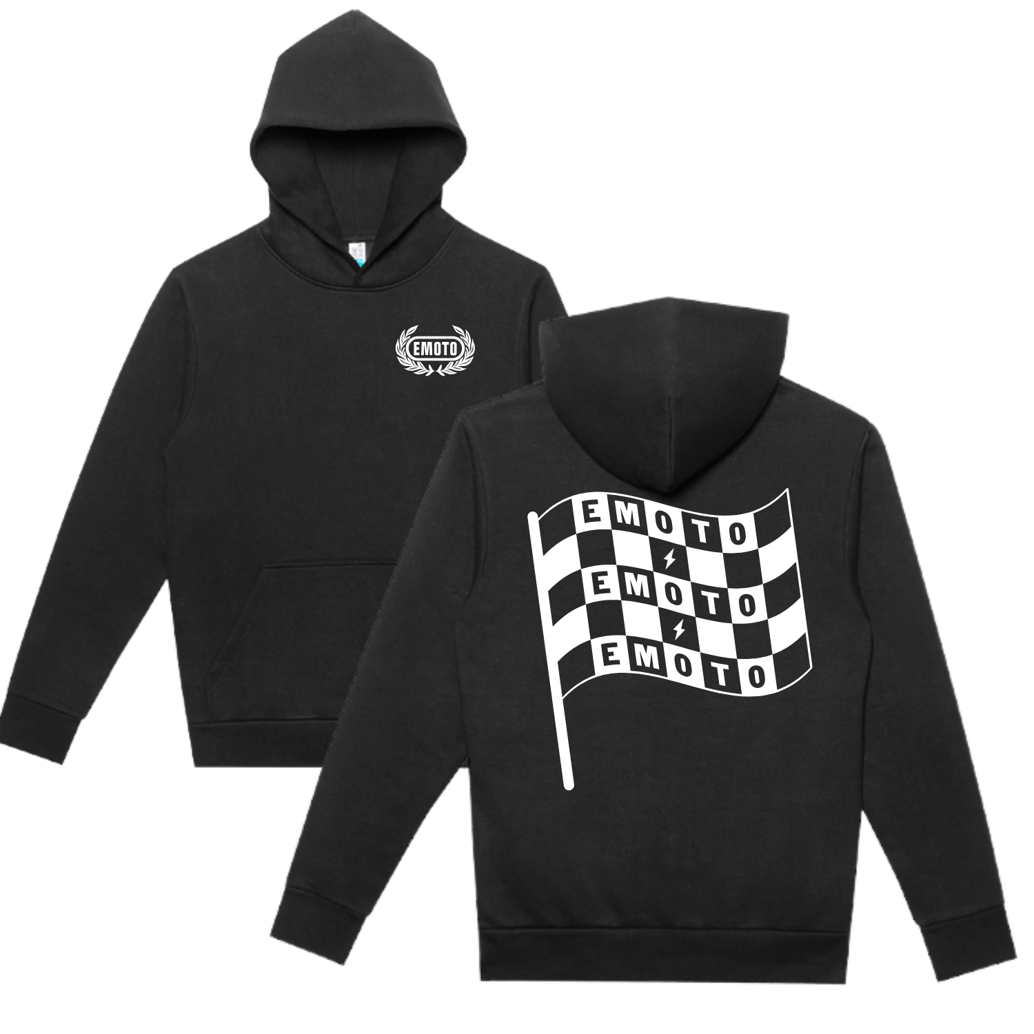 The pigment black wash gives the hoodie a rich, vintage tone, while the white EMOTO crest and racing flag graphic stand out with sharp contrast.
