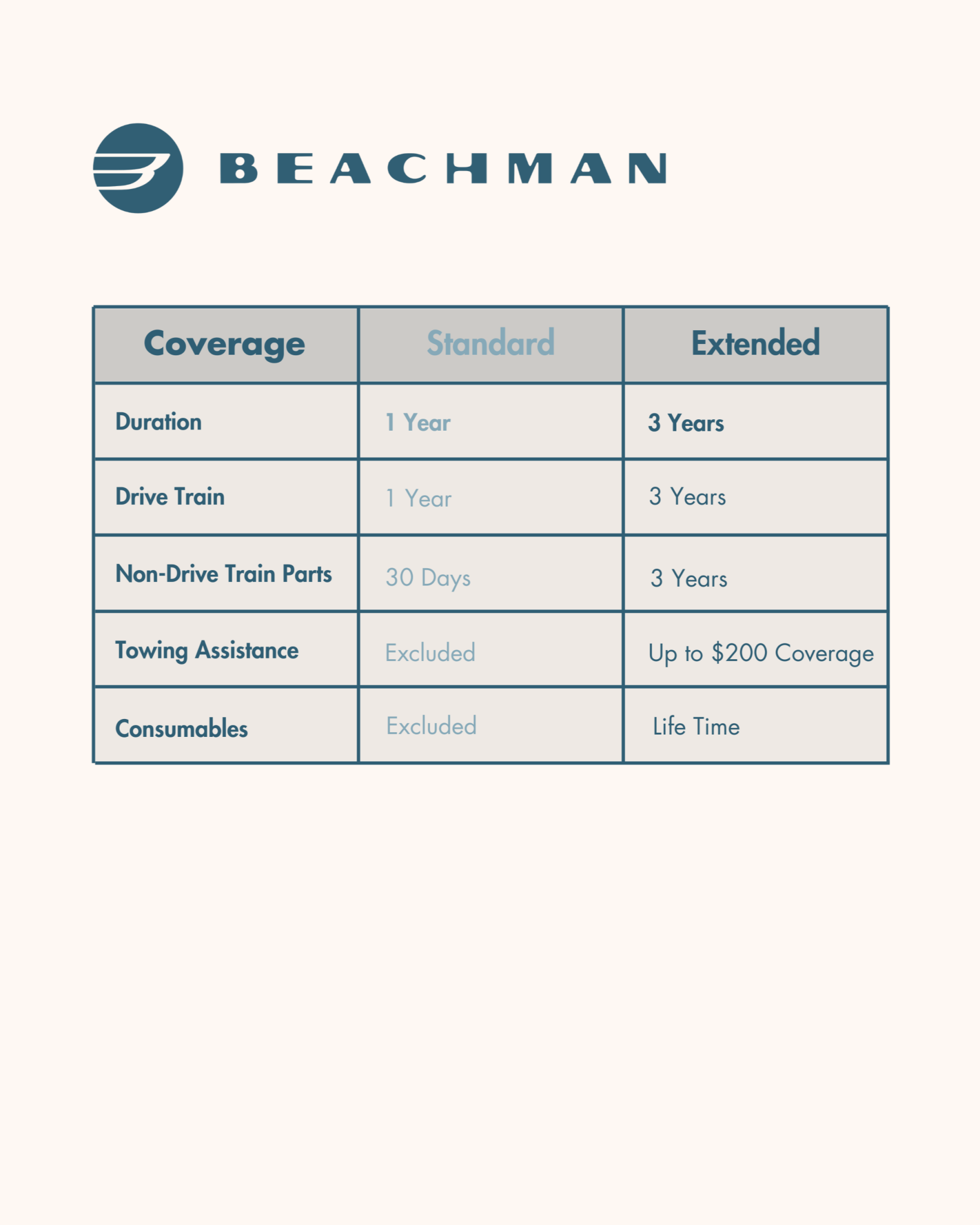 Every Beachman comest with a standard 1-year warranty that covers the drivetrain for the first year of use. By purchasing this Extended Warranty, you’ll extend your drivetrain protection to 3 years and gain several additional perks and coverages.