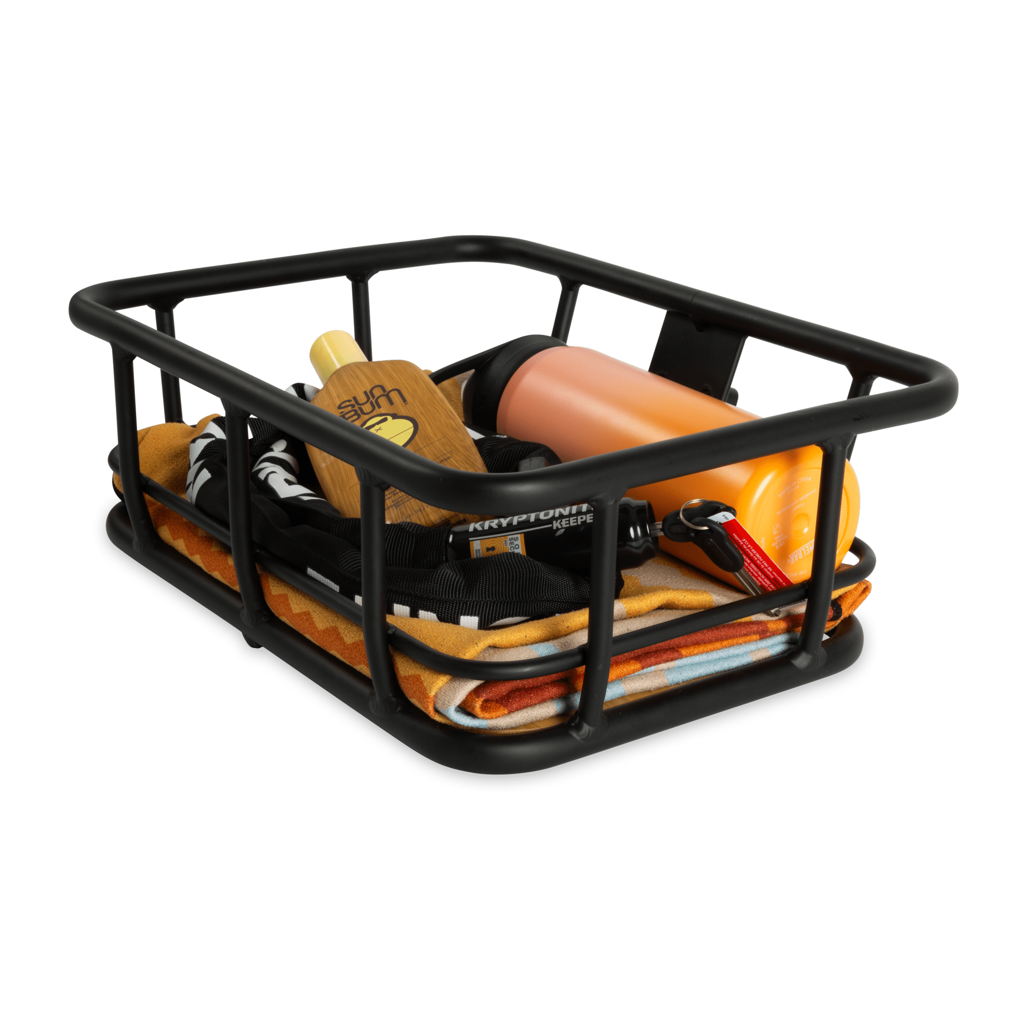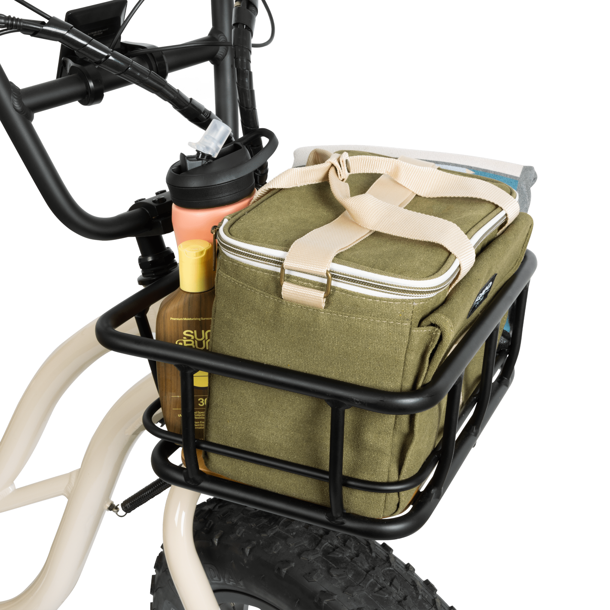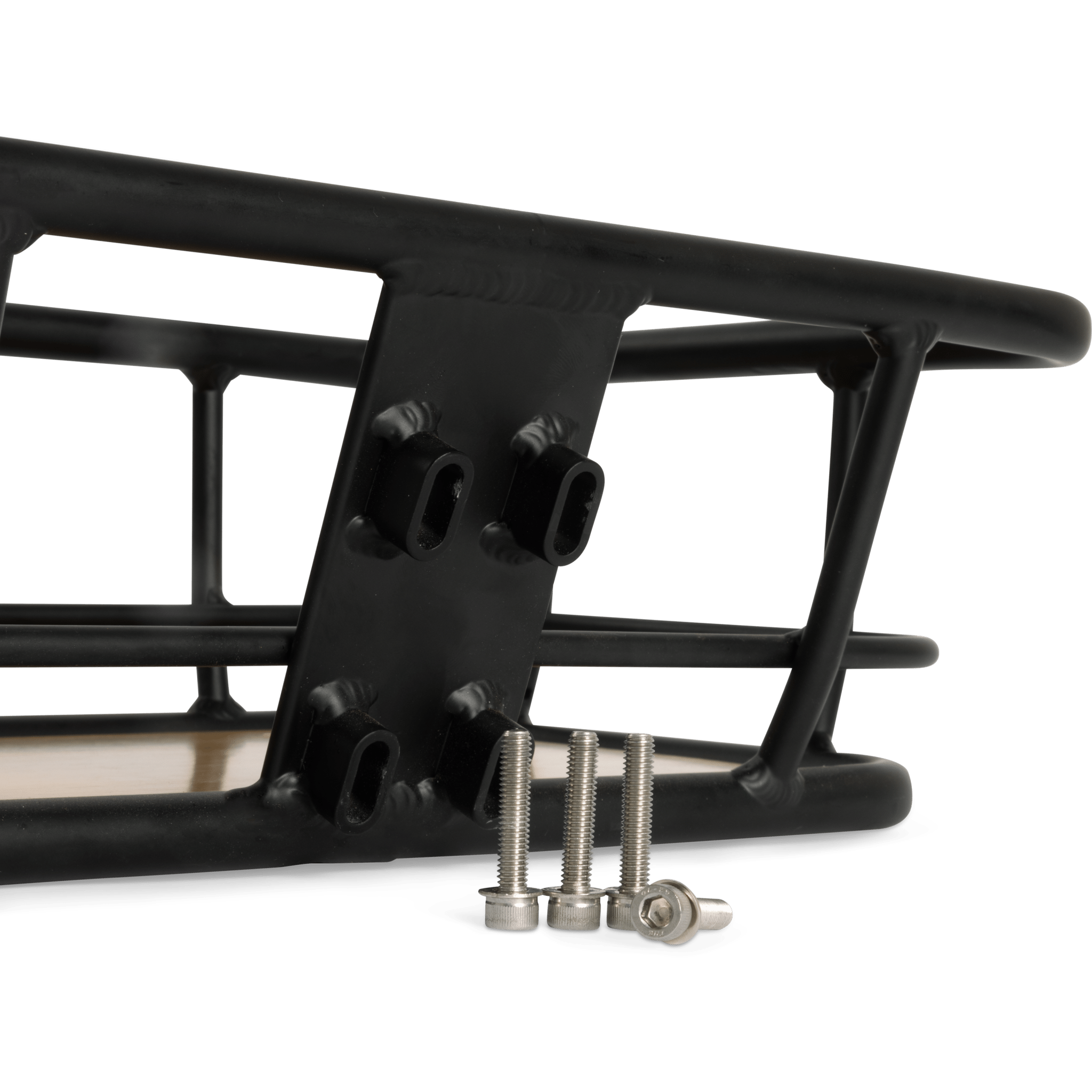 Front Basket: Elevate your Murf biking experience with the Front Basket. The Front Basket offers ample space to carry your essentials, from groceries to your daily gear. Its powder coated aluminum construction and bamboo bottom ensures durability, while the easy installation makes it a hassle-free addition to your Murf adventures. Add a Bungee Net to secure your cargo while you ride!