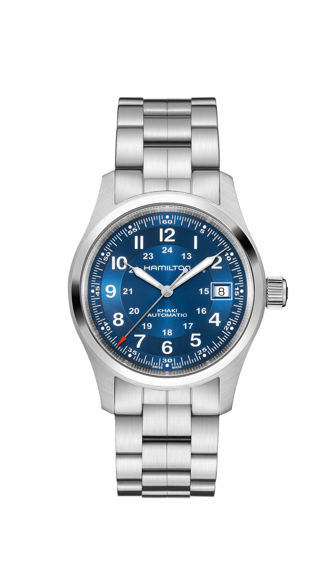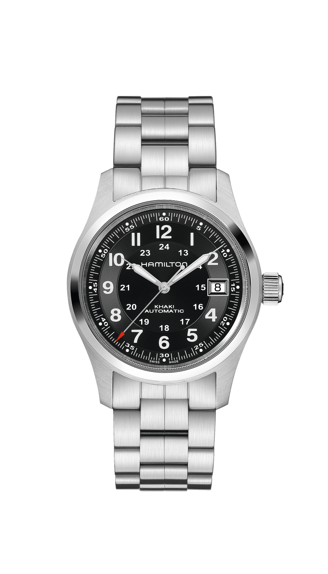 KHAKI FIELD AUTO 38MM When you're planning an expedition, your essential equipment is reliable, resilient, functional and compact. At 38mm, this watch is punching above its weight when it comes to military inspired features. Bold looks, a rugged and robust case and strap and a movement that won't let you down. With 80 hours of typical power reserve in the exclusive H-10 automatic caliber, the Khaki Field Auto will keep you going.