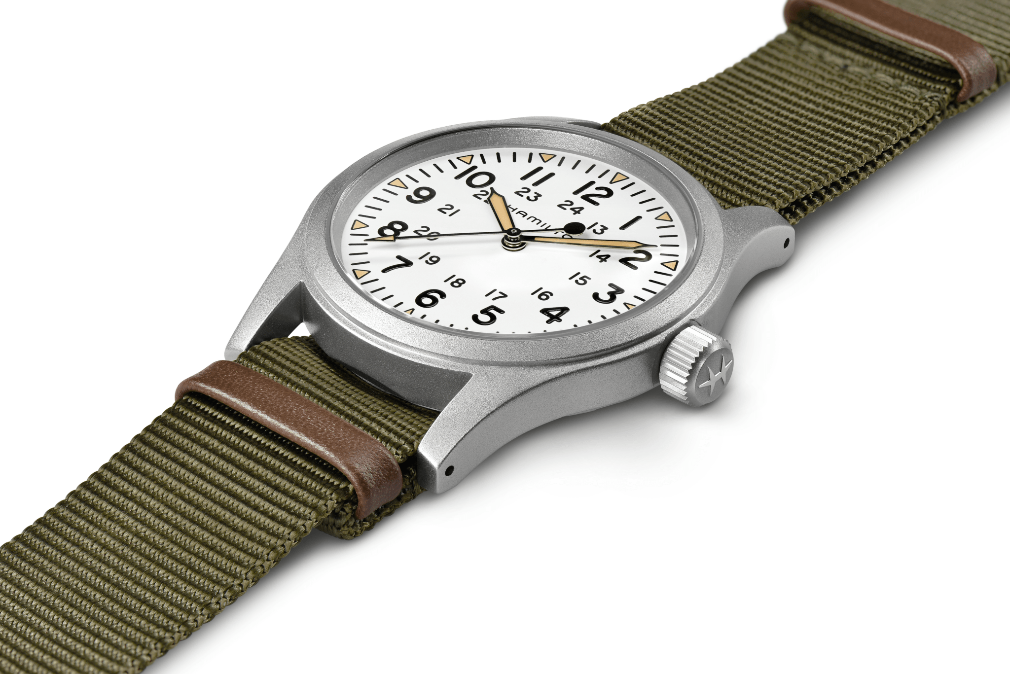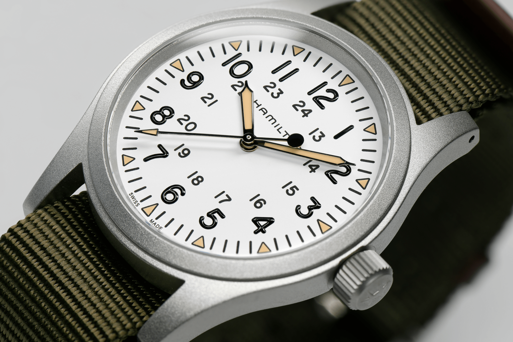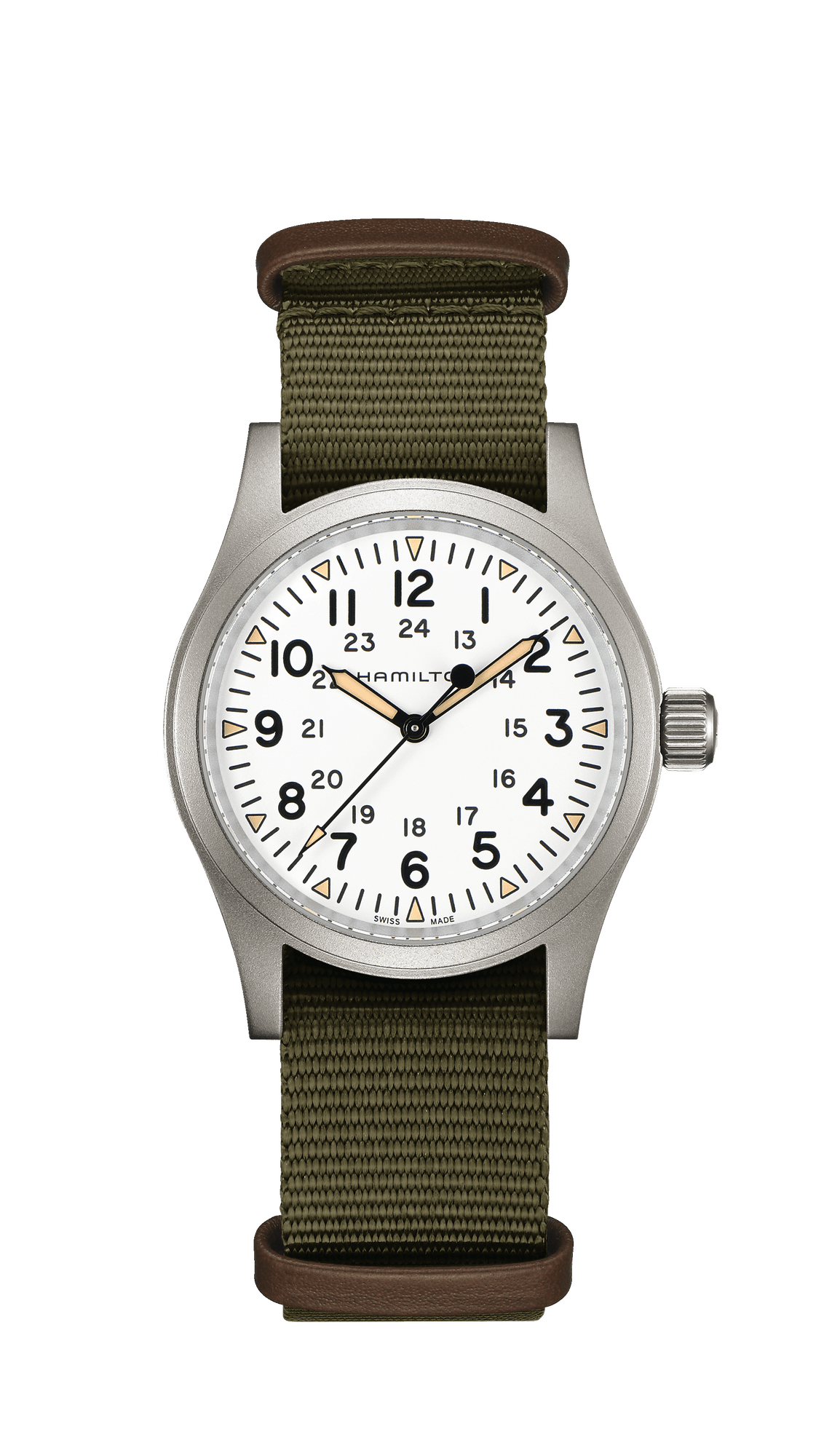 38 mm matt stainless steel case, three hand display, white dial, triangular indexes with old radium color Super-LumiNova®, durable NATO strap: The new Khaki Field Mechanical is a faithful recreation of its original 1960s forebear and is true to Hamilton’s military heritage. Inspired by the military, built to last, this is the original soldier’s watch.