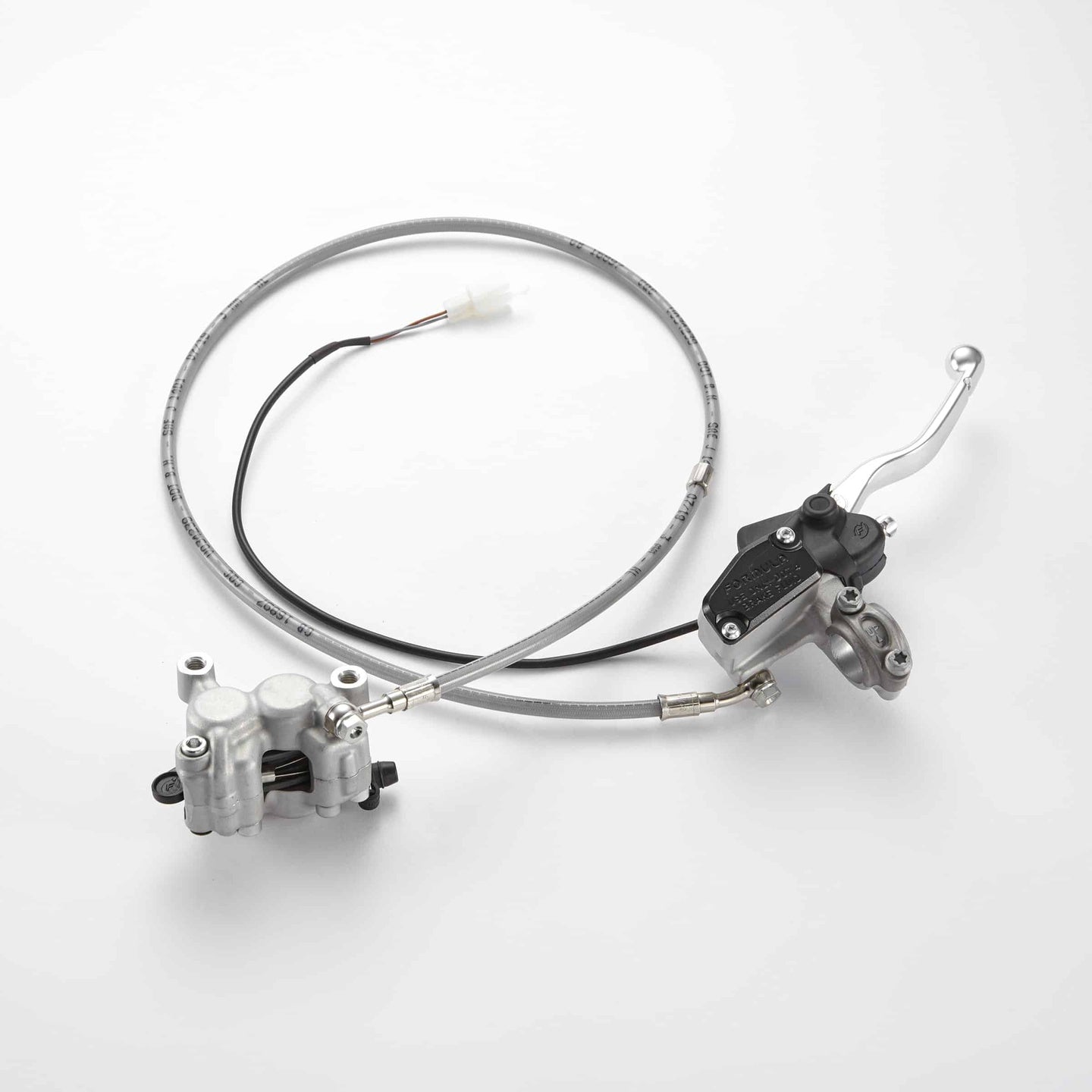 Complete front brake system for the Kalk, activated with the controls on the right side of the handlebar.