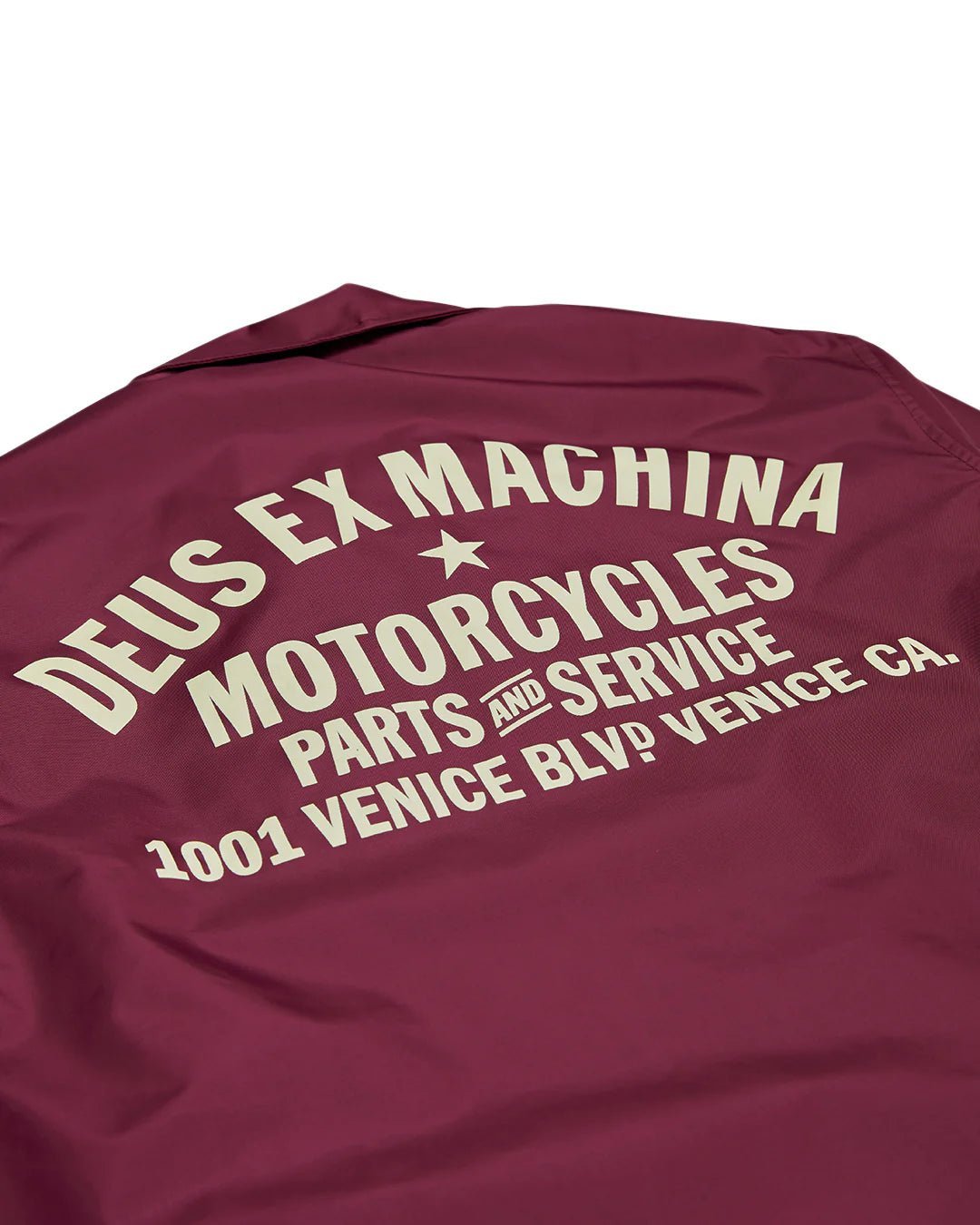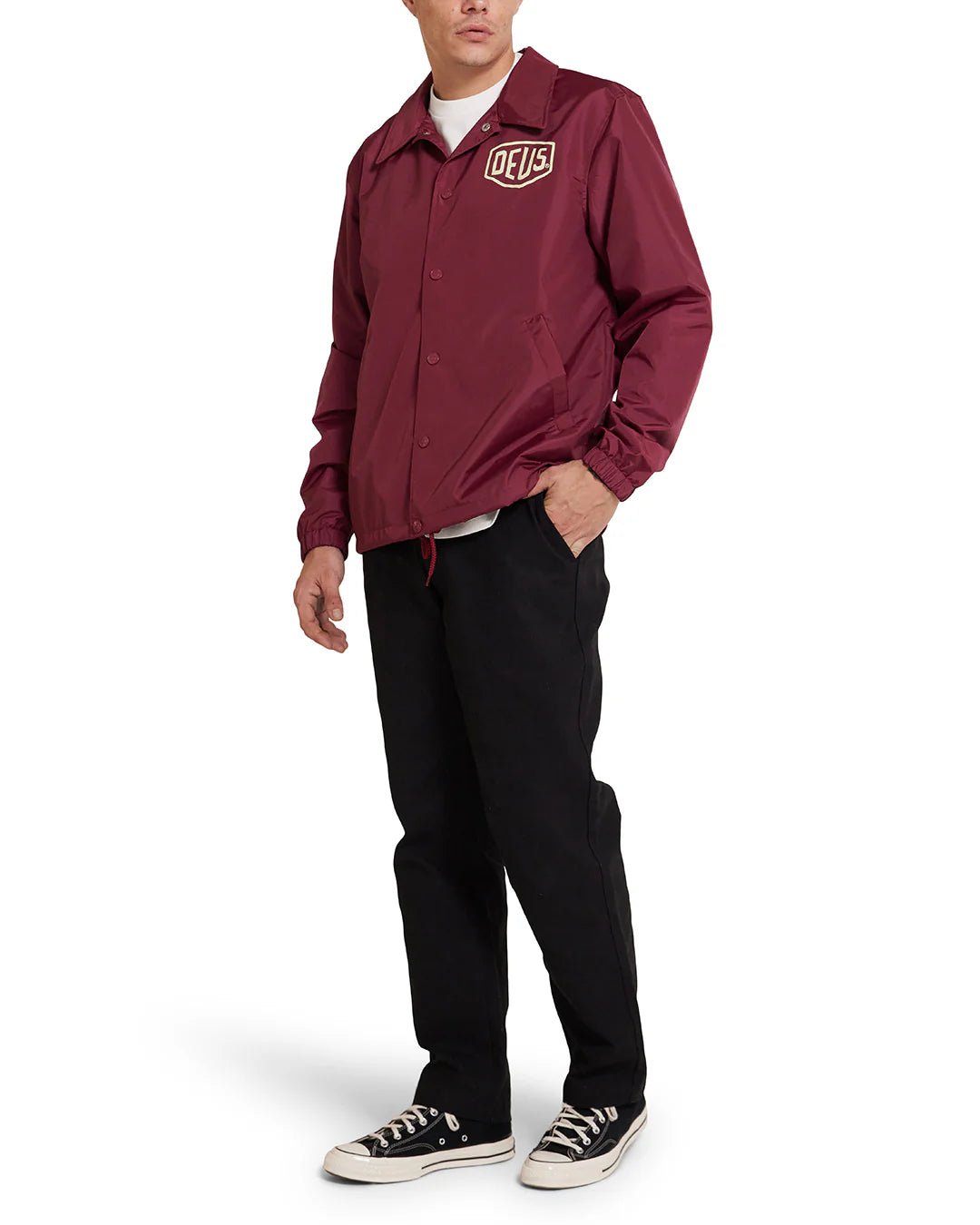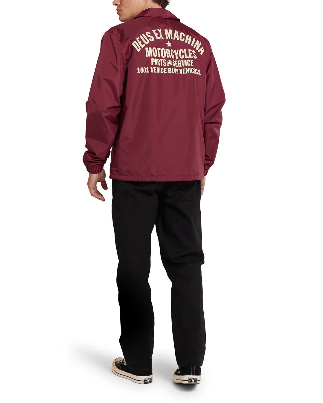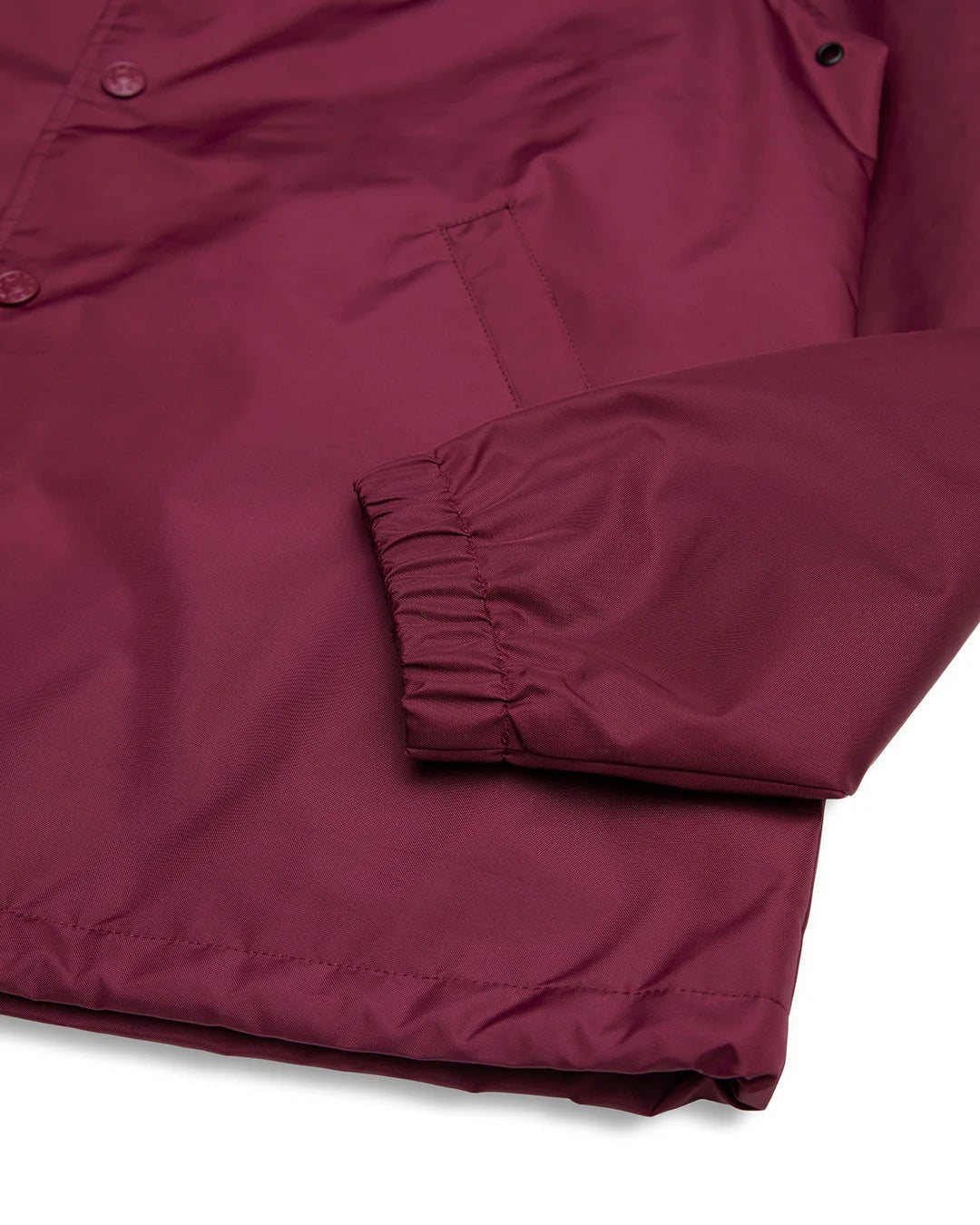 Regular fit classic coach jacket with chest and back address print and branded snap button closure. Recycled Nylon Fabrication.