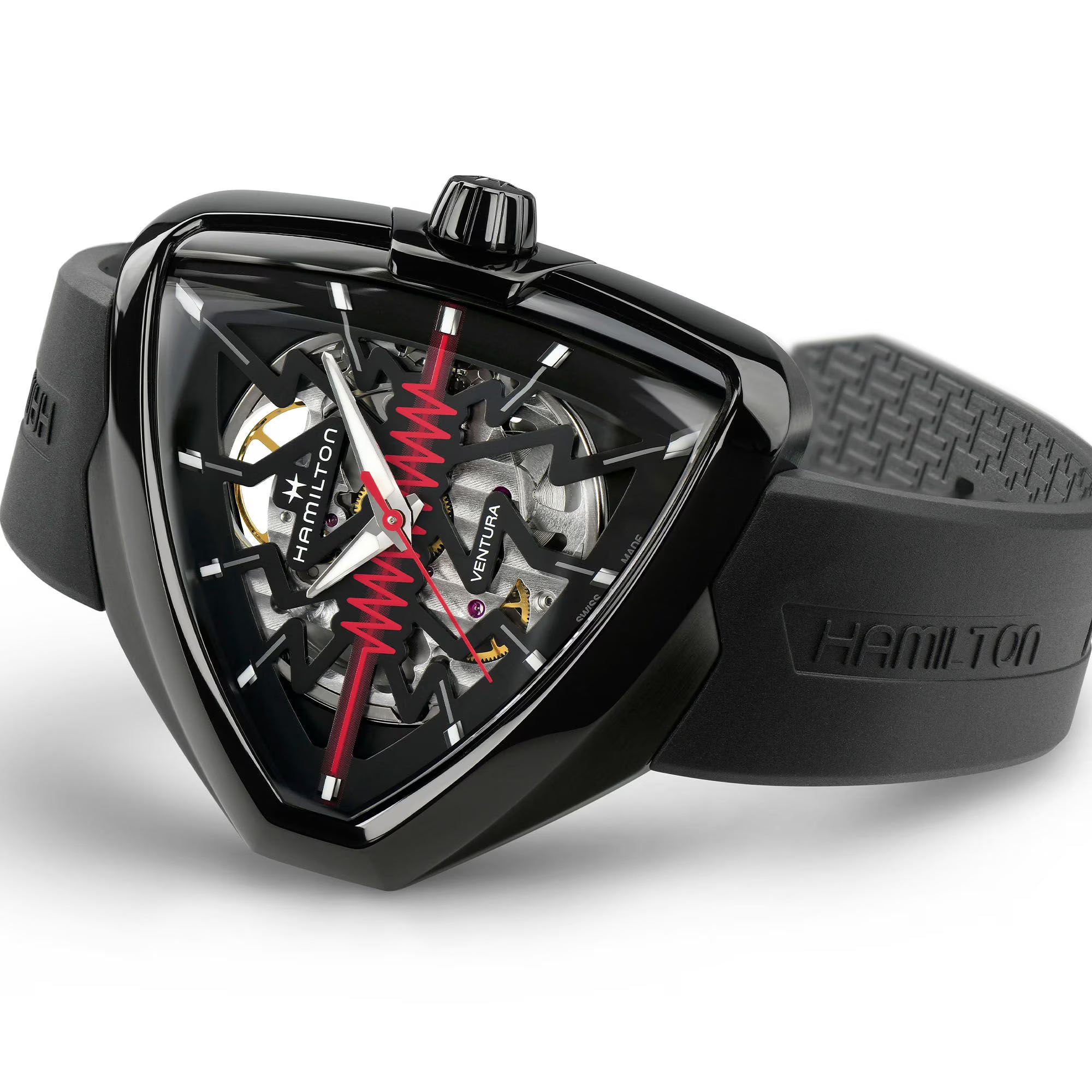 Dare to be bold with the Ventura Elvis80 Skeleton, an ultra-modern tribute to the past, present and future of the world’s first electric watch. A powerful evolution of a revolutionary timepiece, its precise skeletonized dial features a striking red zigzag at the center of its sleek, black PVD-coated, triangular case. This bolt of energy celebrates an iconic symbol of innovation and draws the eye to the automatic H-10-S movement underneath.